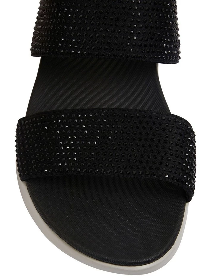 Master low key looks with high impact style wearing NOVATO. The open toe slip on design is crafted with a double foot strap adorned with co-ordinating diamantes, featuring a moulded comfortable foot bed, then rest on a slightly elevated back sole. Slip them on as a timeless accent to a vacation edit.