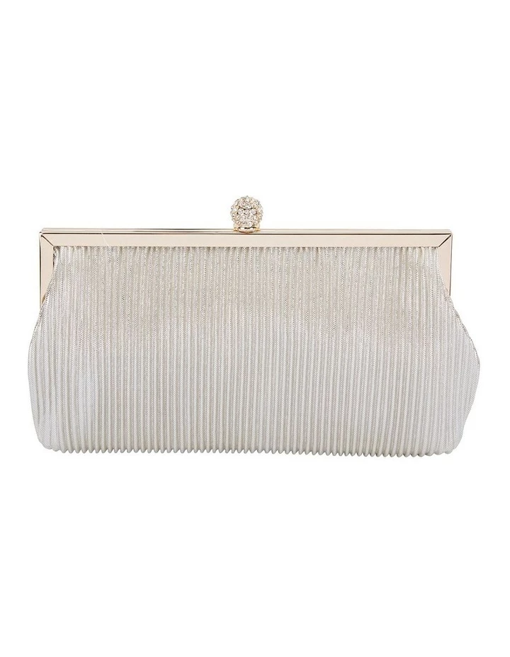 ANEKA features elegant pleated detailing, a crystal encrusted snap lock closure and removable flat curb chain.