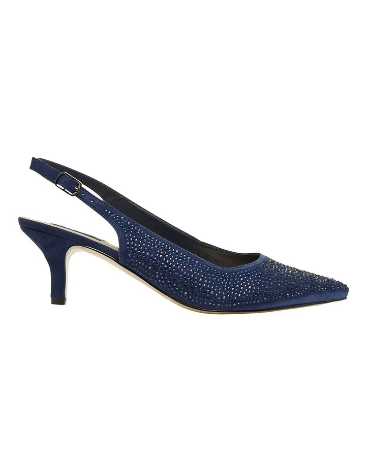 Dazzle on the dance floor with Teagan. This sleek kitten heel pump is adorned with embellishments, an adjustable sling back strap and on-trend pointed toe heel.