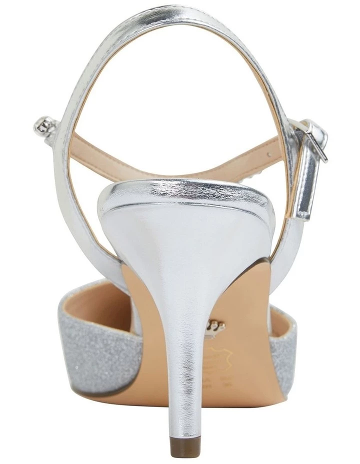 – Approx 7.5cm heel height – Fabric upper, Synthetic lining & Composite leather sole- Jewel encrusted ankle strap- Pointed toe shape- Silver Glitter upper shade