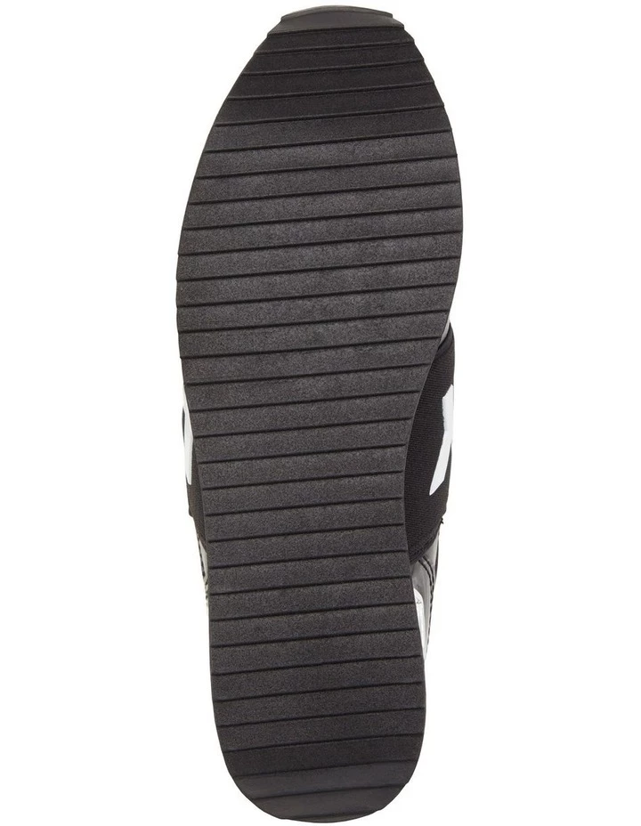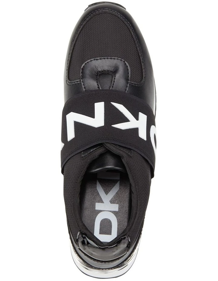 Slip on sneaker with rubberized DKNY logo on elastic strap across vamp, metal plate on counter, round toe, memory foam footbed.
