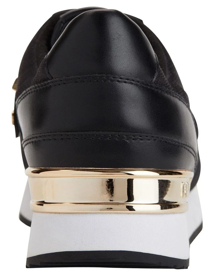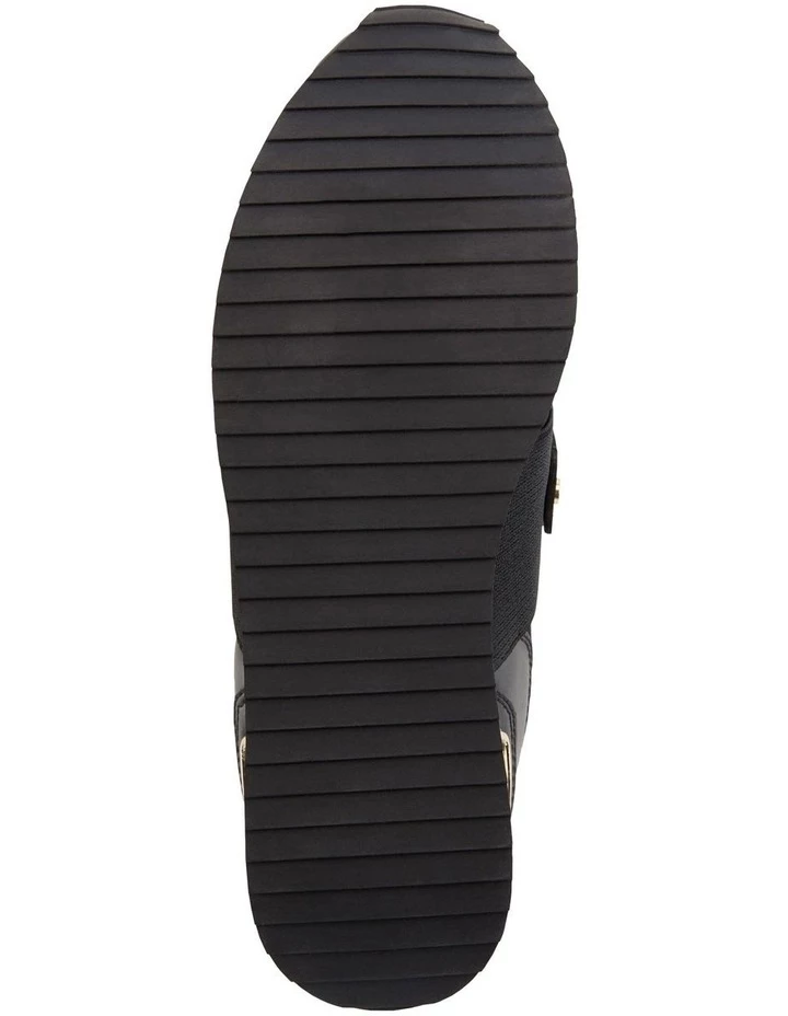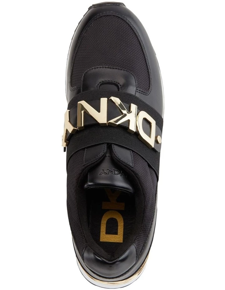 Slip on sneaker with DKNY metal letters on elastic strap on upper vamp, metal rand on back counter, round toe, memory foam footbed.