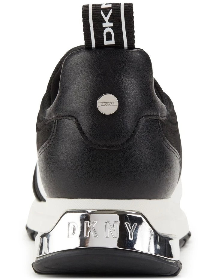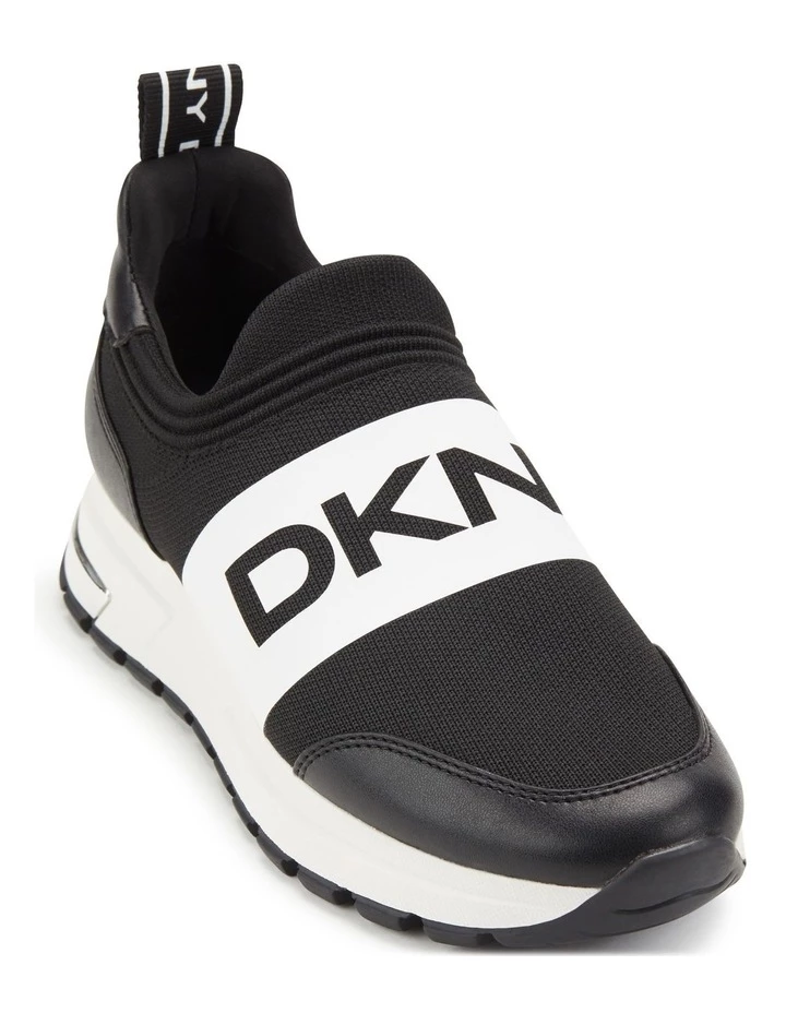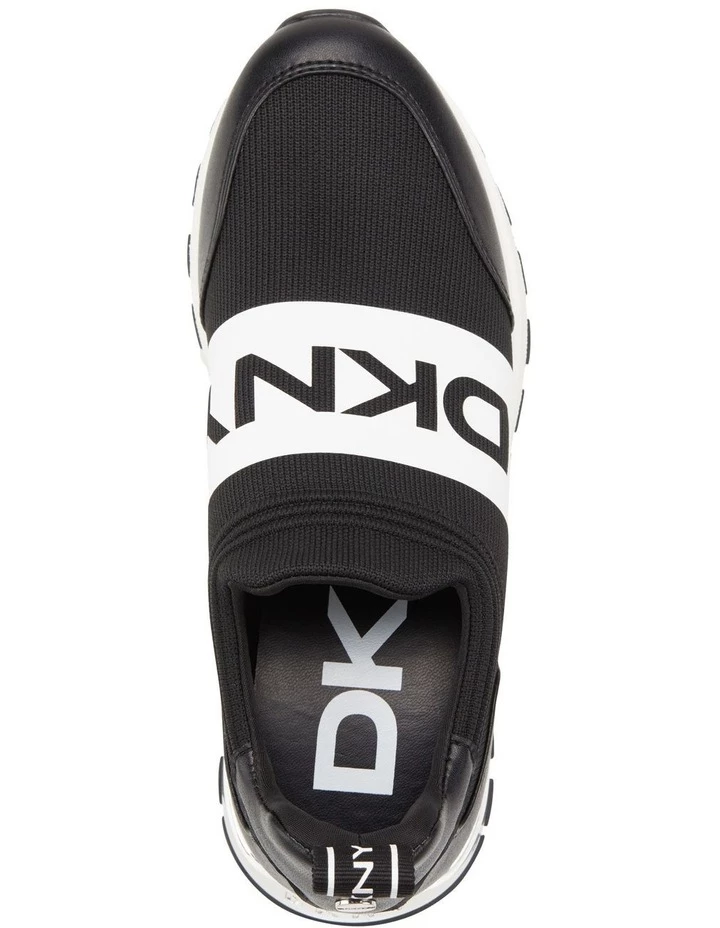 Slip on sneaker with DKNY logo across upper vamp, DKNY logo taping pull tab, metal rand on counter, round toe shape, memory foam footbed