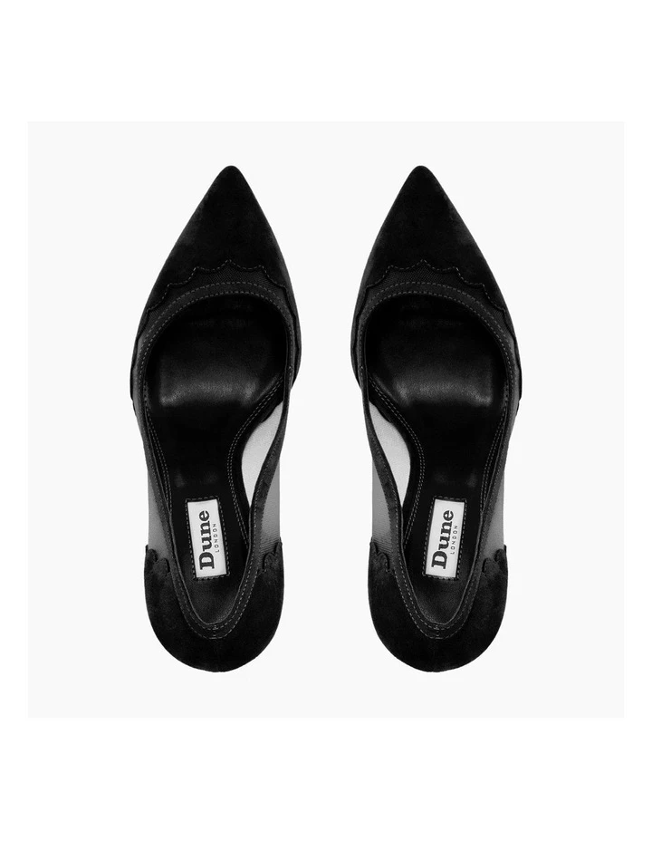 Refresh your footwear lineup with the feminine charm of the Bellevue court. Decorated with scalloped trim it is finished in luxuriously soft suedette. Elevated by a timeless stiletto heel it is framed by translucent panels.