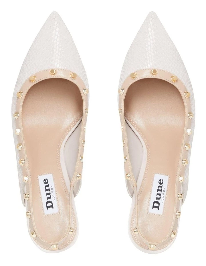 Studded slingbacks to anchor loud outfits. Defined with a pointed toe they’re adorned with striking studded accents. Resting on a mid stiletto heel.