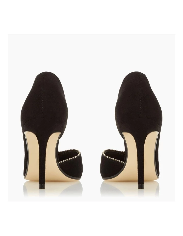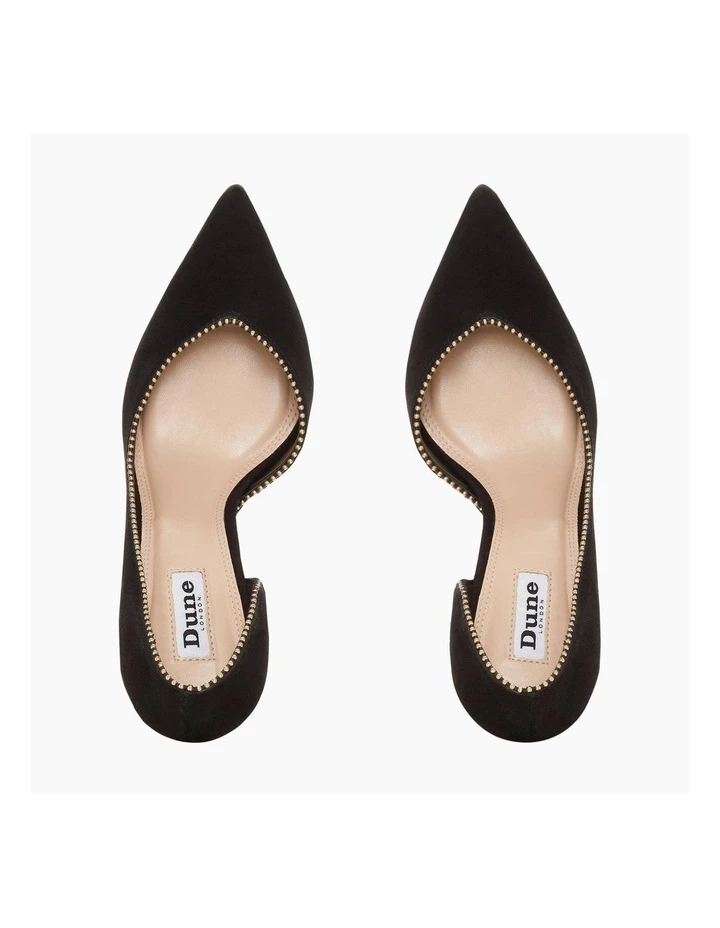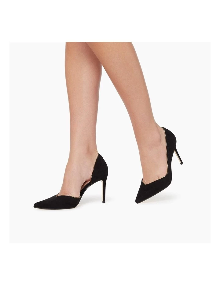 Compliment formal looks with the Dream court shoe from Dune. Cut from suede it’s shaped with a pointed toe. While gold metal embellishments decorate it.