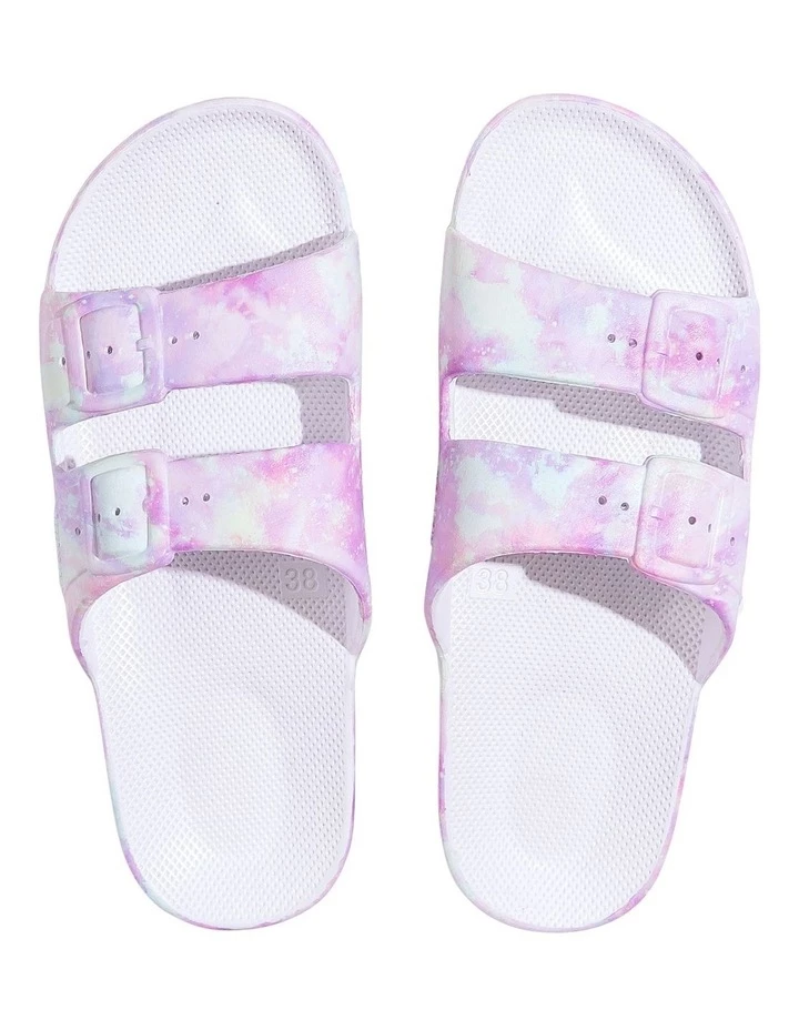 Freedom Moses are all about celebrating summer 365 days a year. Freedom Moses slides are vegan, cruelty-free and injected with air so you feel like youre walking on a cloud. All slides are lightly scented with milk and honey, helping you feel calm and carefree throughout the day.