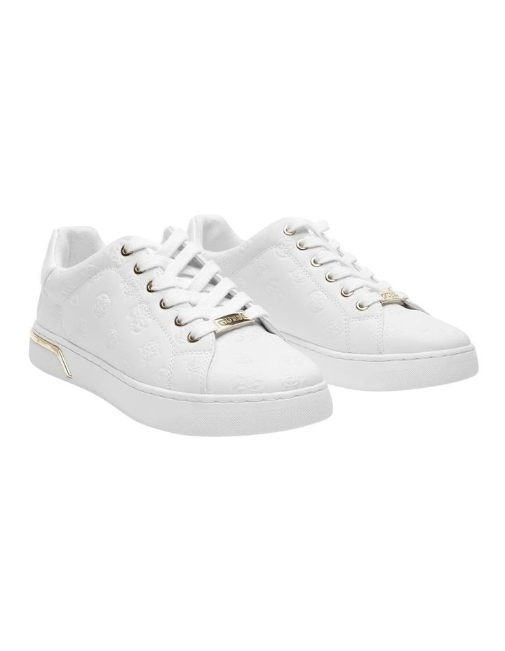 Crafted from white Guess logo patterned PU, these low sneakers feature a metallic trim which gives them a designer edge.