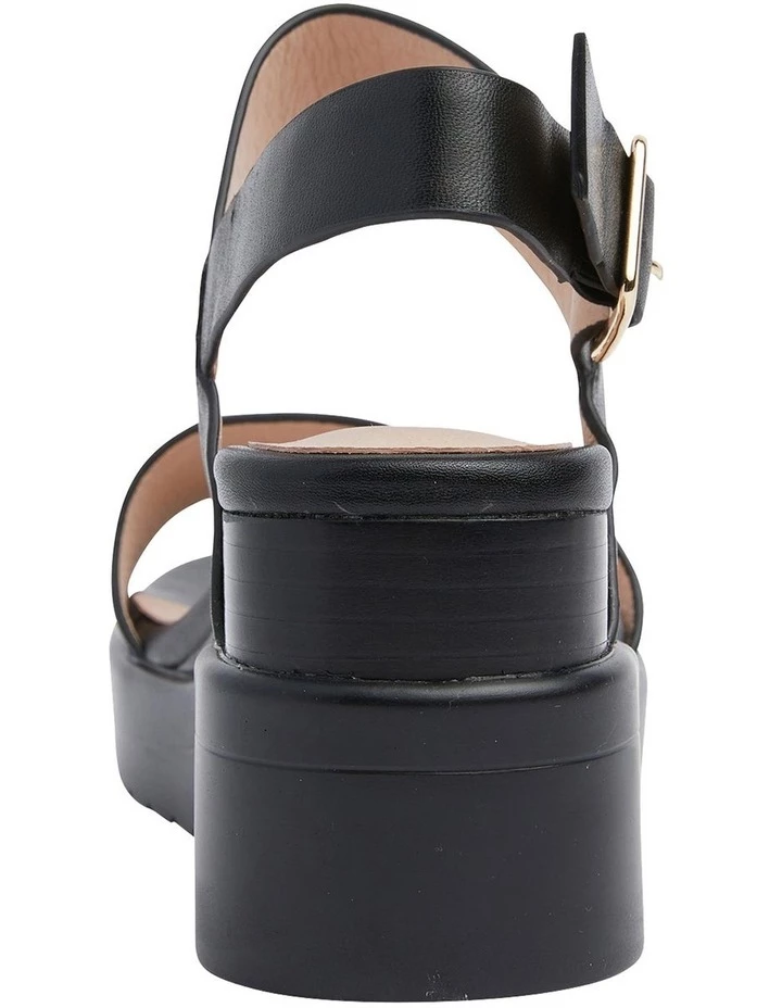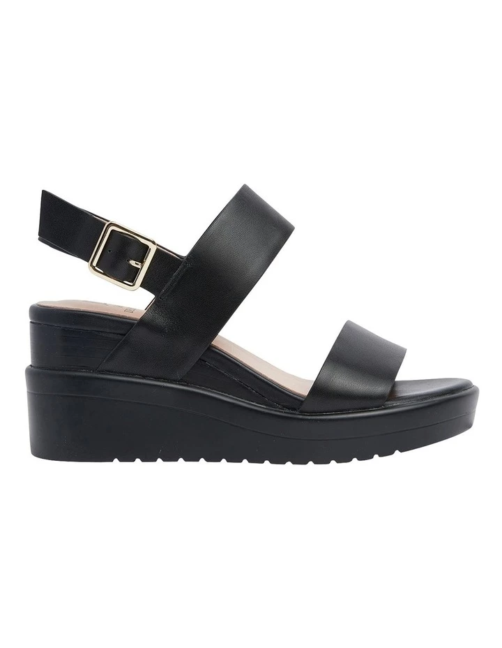 Bringing a twist to the modern wedge heel, INDIANA features a soft serrated sole edge and sling back buckle detailing. The unusual cutout T-Bar design not only maximizes comfort but will keep you securely strapped in all day long. Take this luxe wedge to new heights with a monochromatic skirt and gold statement jewelry. Approx. 7cm heel height Leather upper, Leather lining & Leather sock Synthetic grip sole Round toe shape design Added underfoot padding Standard fit (B-fit)