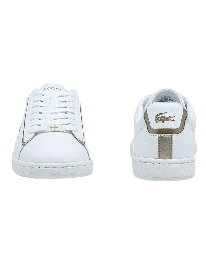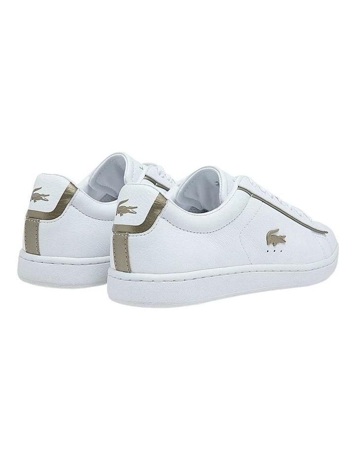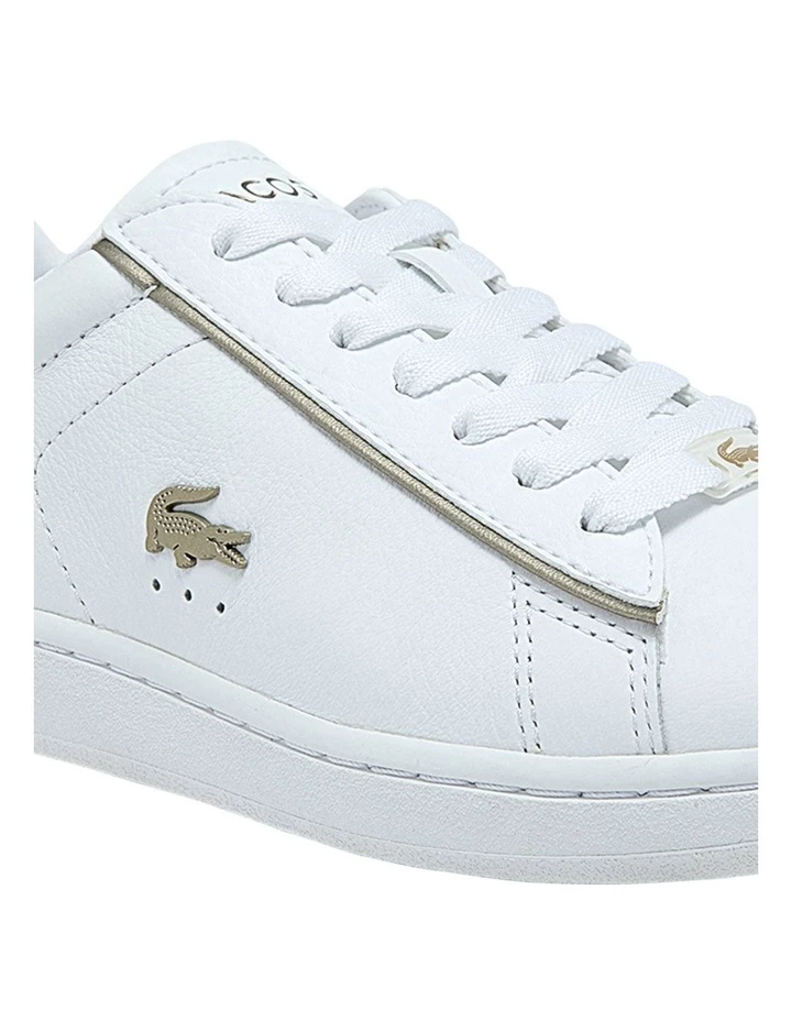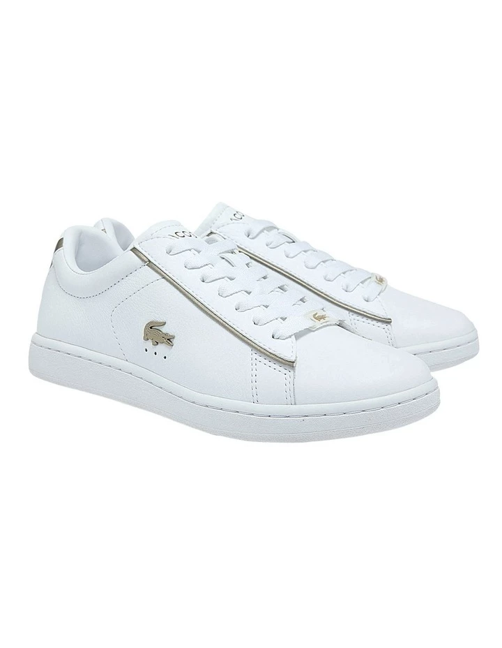 Lacoste’s timeless tennis aesthetic is captured in the Carnaby Evo sneaker. Tumbled leather uppers are topped with a textured tongue for tactile appeal, while gleaming platinum crocodile branding on the quarter panel and a sophisticated jewel on the laces imbue the design with a sleek sensibility. The slender lace-up shape and block colour vibe forge a minimalist backdrop for easy-to-style, everyday wear.
