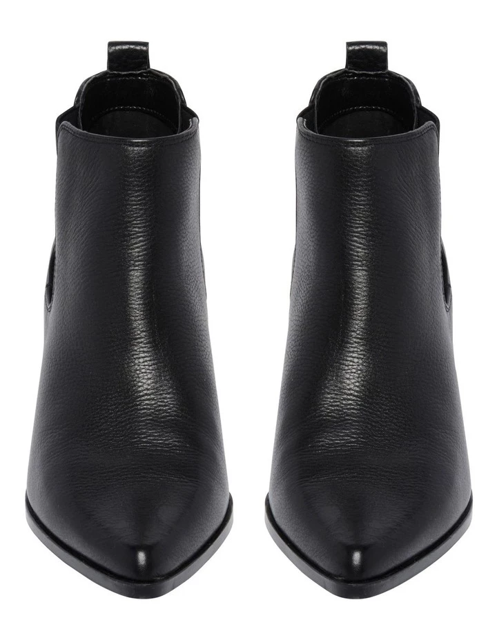 The classic and minimalistic design of the Savita Boot will effortlessly look chic and classic with almost any outfit. The sleek pointed toe front, sturdy low block heel and pull on tab at the back of the ankle means for a comfortable yet fashionable wear. The small stitching detail around the elasticated sides and boot opening adds an interesting design feature to this otherwise simple and minimal boot aesthetic.