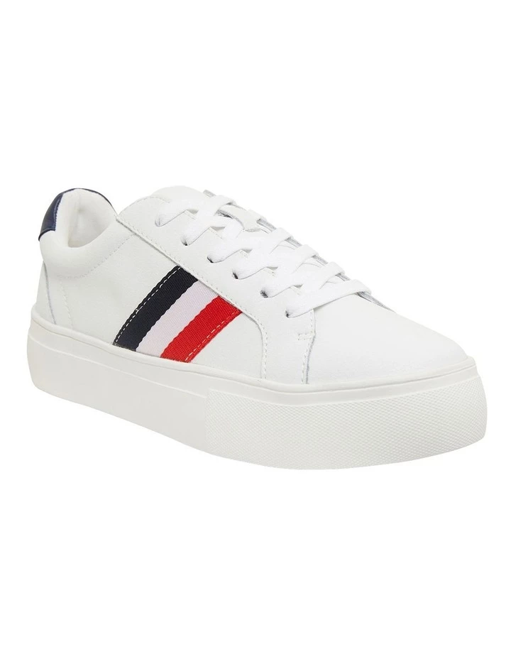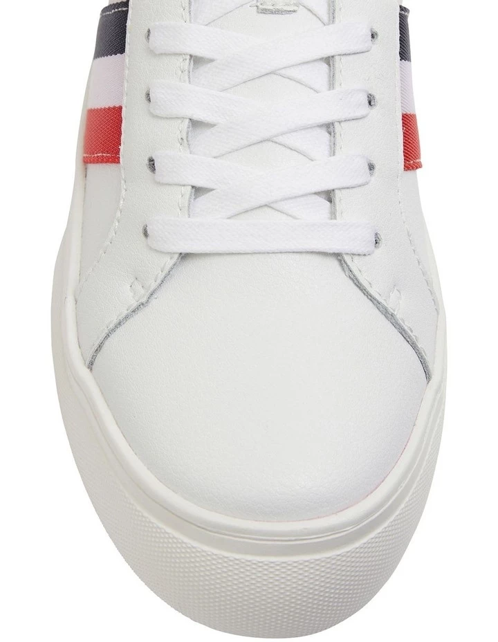 FALLON takes on an eye-catching approach to the classic white sneaker silhouette. The smooth leather upper and white neat lace up front are partnered with a stripe design stitched onto the side panel and co-ordinating heel panel, then rest on a comfortable flatform sole. Ideal for a seasonal wardrobe edit, pair them with tailored pants to partnered dresses.