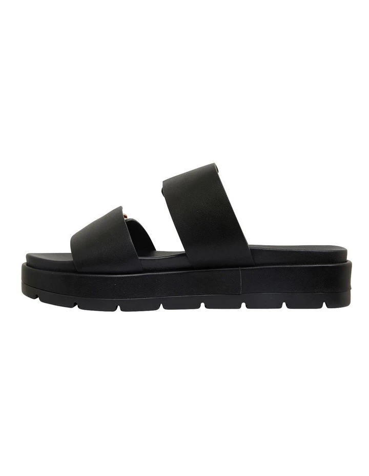 FICTION captures considered elegance with this laid back silhouette. They feature a classic two-strap construction accented with gold hardware, moulded footbed for day-long comfort and support and then set on a raised flatform sole. Complete the outfit by pairing this with gold jewellery and high a-line skirts.