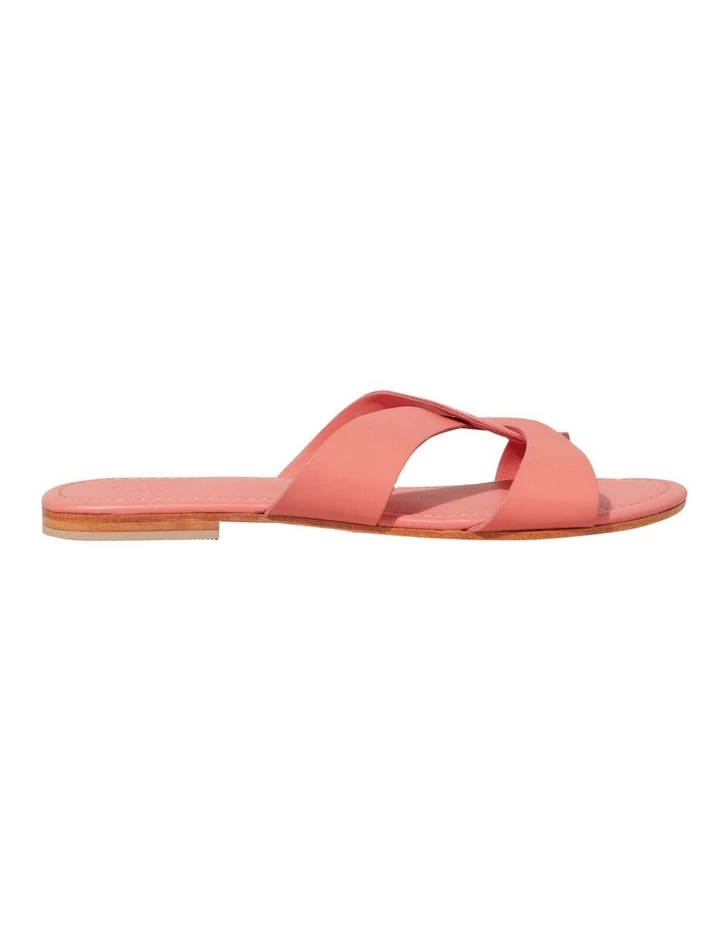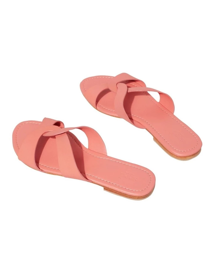 Smooth bands of leather are looped together to create the strap of these slip-on sandals. The chic style is elevated by the minimal silhouette, and the straps are colour matched to the flat sole.