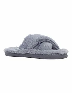 Perfect for wearing around the house, these faux fur crossover slippers add comfort and style to your loungewear. The fluffy material wraps across the foot, and the slippers have a rubber sole.