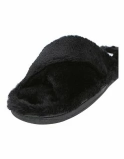 Perfect for wearing around the house, these faux fur crossover slippers add comfort and style to your loungewear. The fluffy material wraps across the foot, and the slippers have a rubber sole.