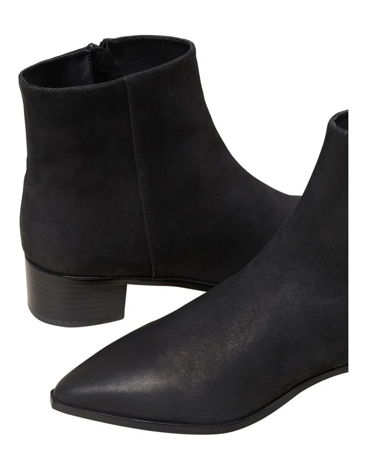Designed in nubuck textured leather, these ankle boots are a wardrobe essential for cooler days. The sleek style comes to a pointed toe and features a 3cm stacked heel for an elongated look. The side zip closure and heel pull tab ensure an easy fit.