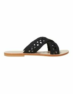 These slip-on sandals feature textured straps made of leather with an intricate cutwork design. The straps cross over at the front, and the sandals feature a flat sole with a 1cm heel.