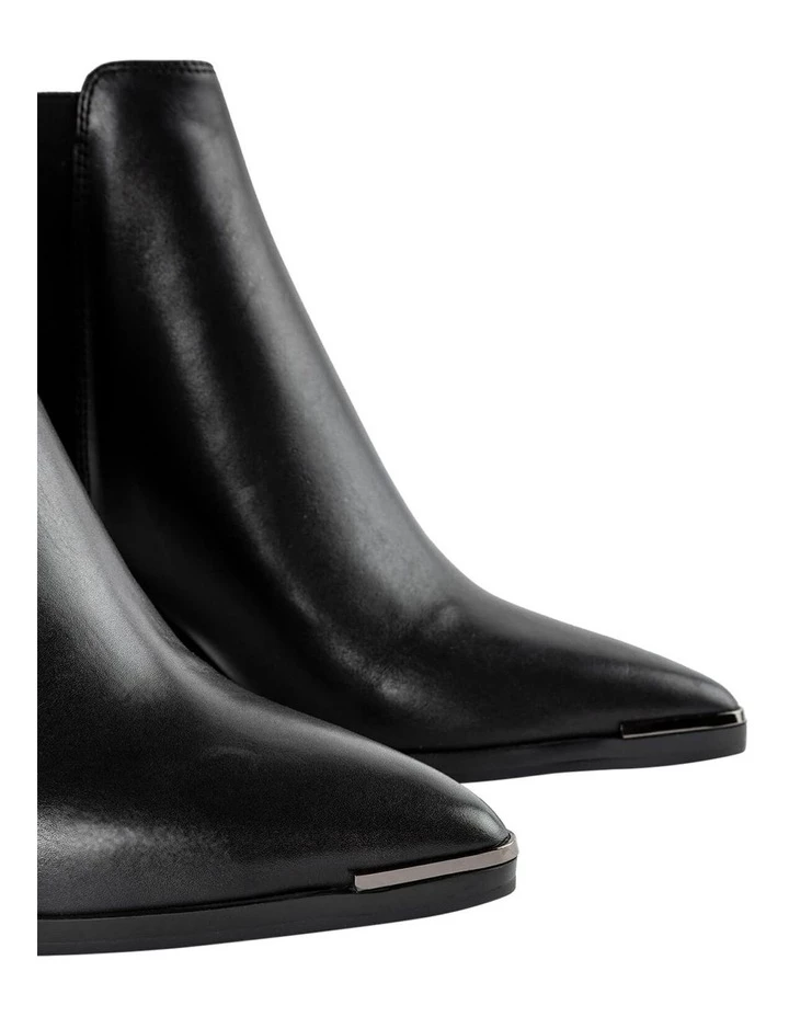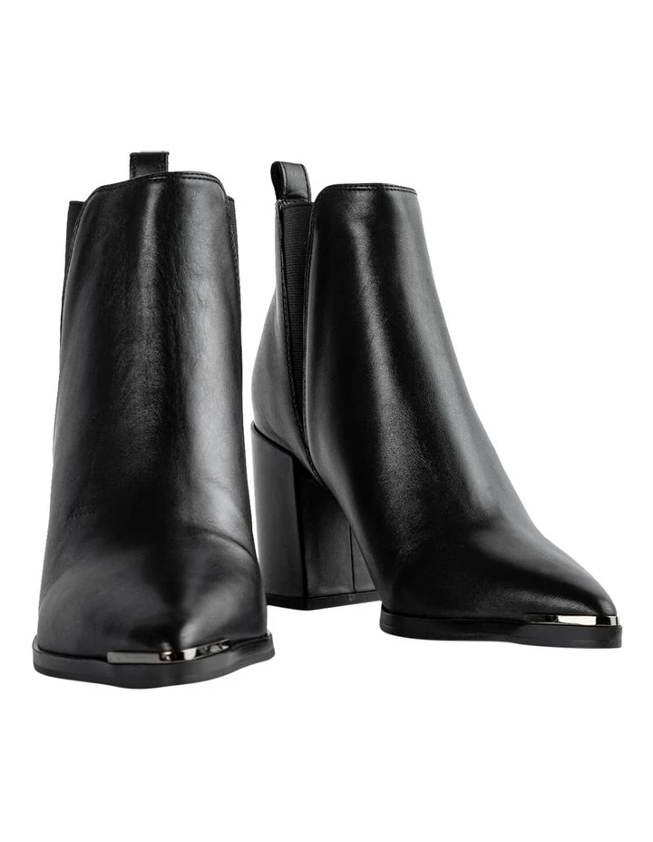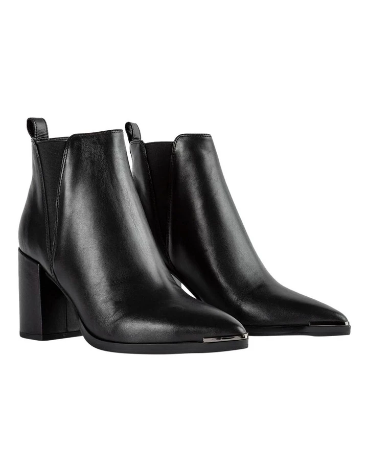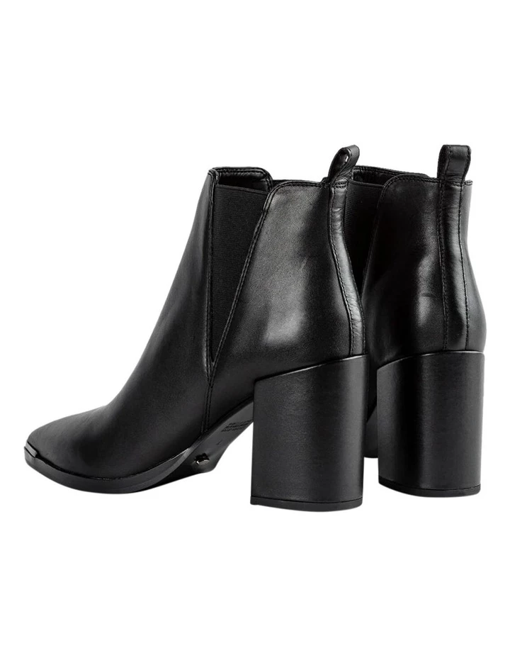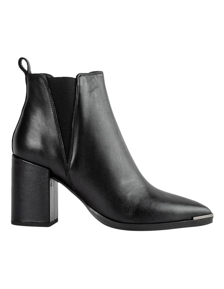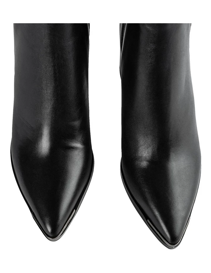 The Tony Bianco Bello classic boot in black leather is designed with a sharp pointed toe with charcoal hardware detail, covered block heel and triangular side gussets.