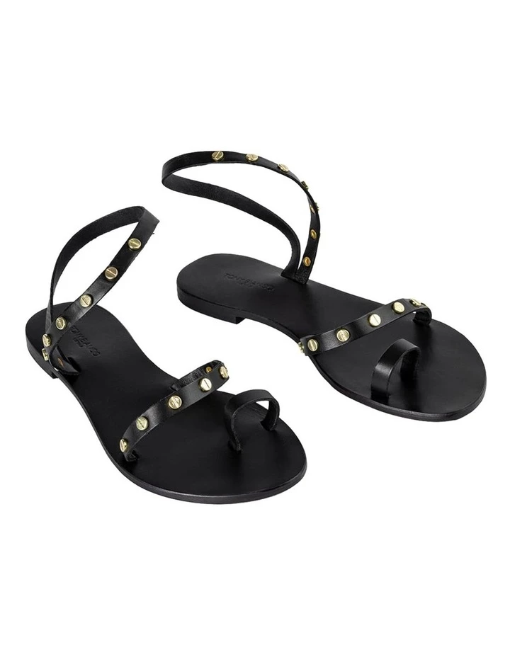 A black leather sandal with a toe ring, strap across the strap and ankle halter with gold-toned hardware.